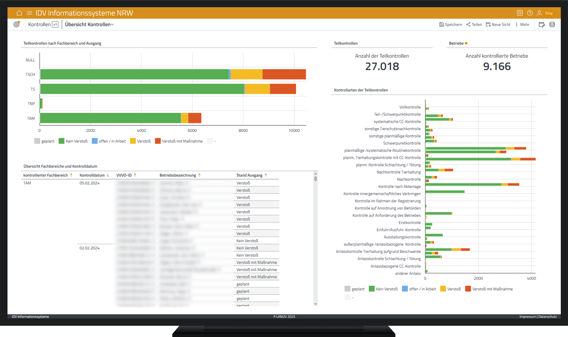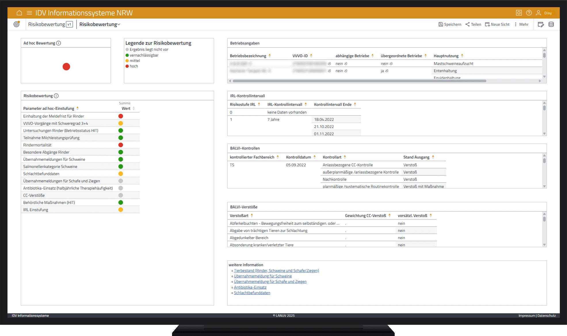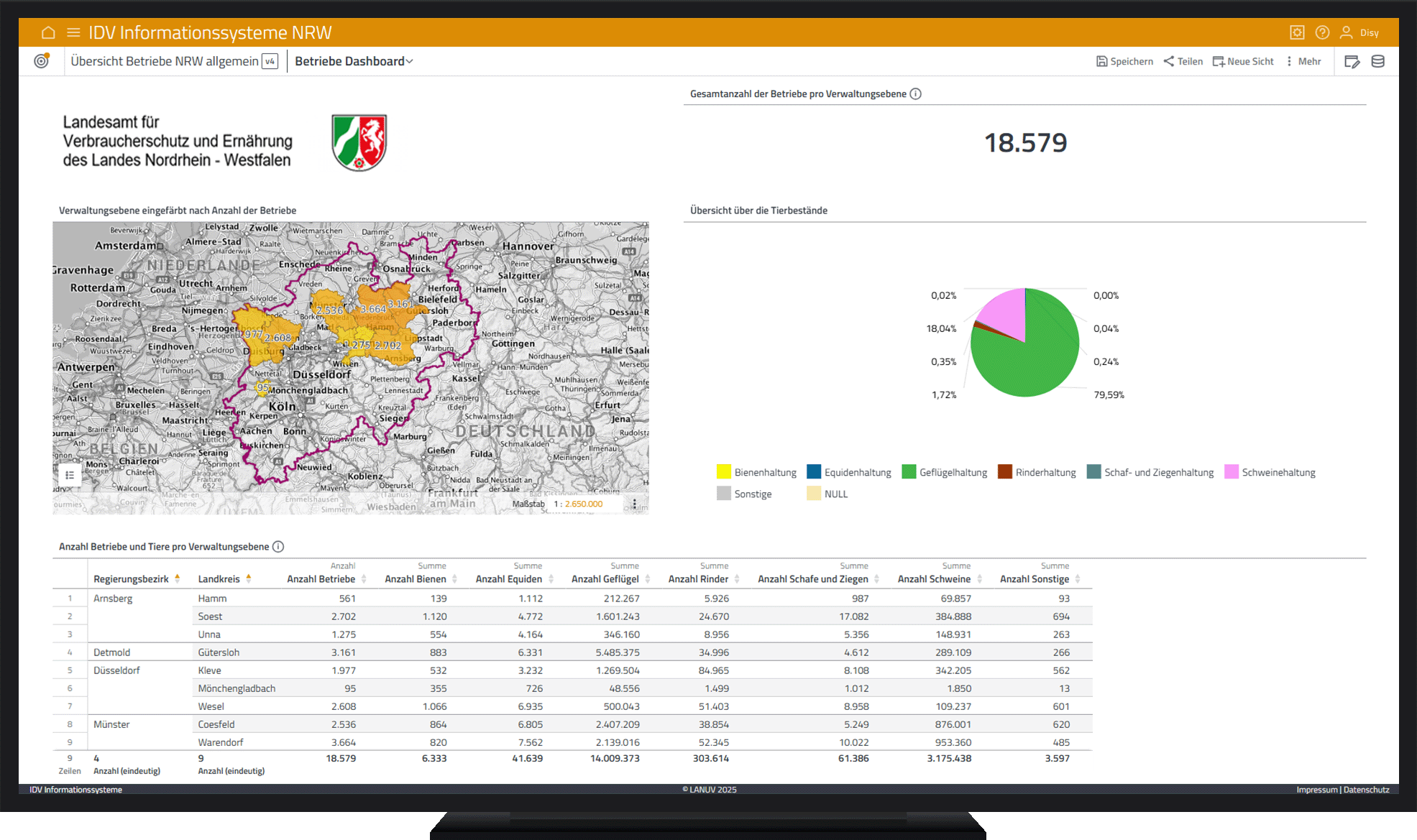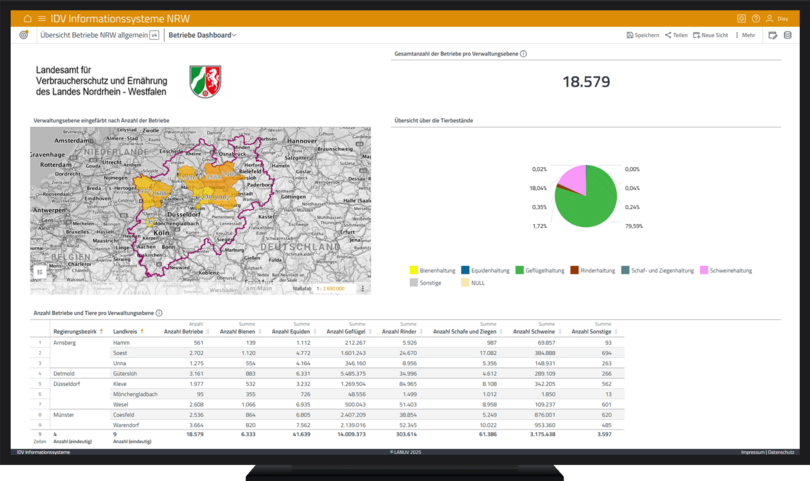 Das Landesamt für Verbraucherschutz und Ernährung Nordrhein-Westfalen (LAVE NRW) nutzt seit 2021 disy Cadenza, um Daten aus tierärztlichen Kontrollen, Schlachtbefunden, Arzneimittelverordnungen und weiteren Quellen zusammenzuführen. Ziel ist es, ein umfassendes Lagebild zur Tiergesundheit in landwirtschaftlichen Betrieben zu erstellen, um durch Transparenz den Tierschutz in der landwirtschaftlichen Nutztierhaltung zu verbessern. Behörden erhalten damit ein Frühwarnsystem und können gezielt und frühzeitig in Betriebsabläufe eingreifen, wenn Defizite in der Tiergesundheit sichtbar werden. Auch Tierhaltende können sich online über die Einschätzung ihres Betriebs informieren und so potenziellen Missständen frühzeitig entgegenwirken. Durch das Zusammenbringen der Daten entsteht Transparenz – und damit die Grundlage für fundierte Entscheidungen.