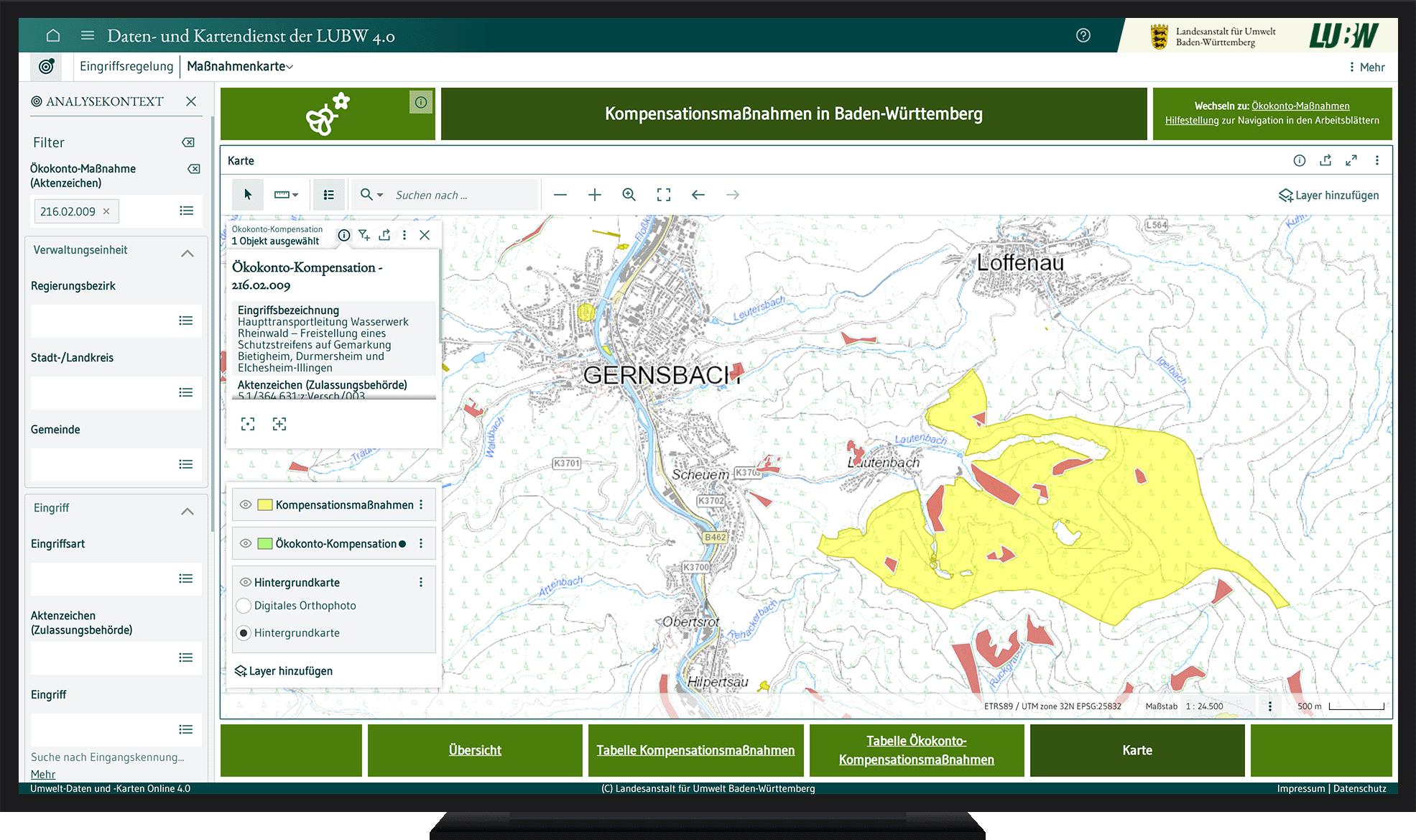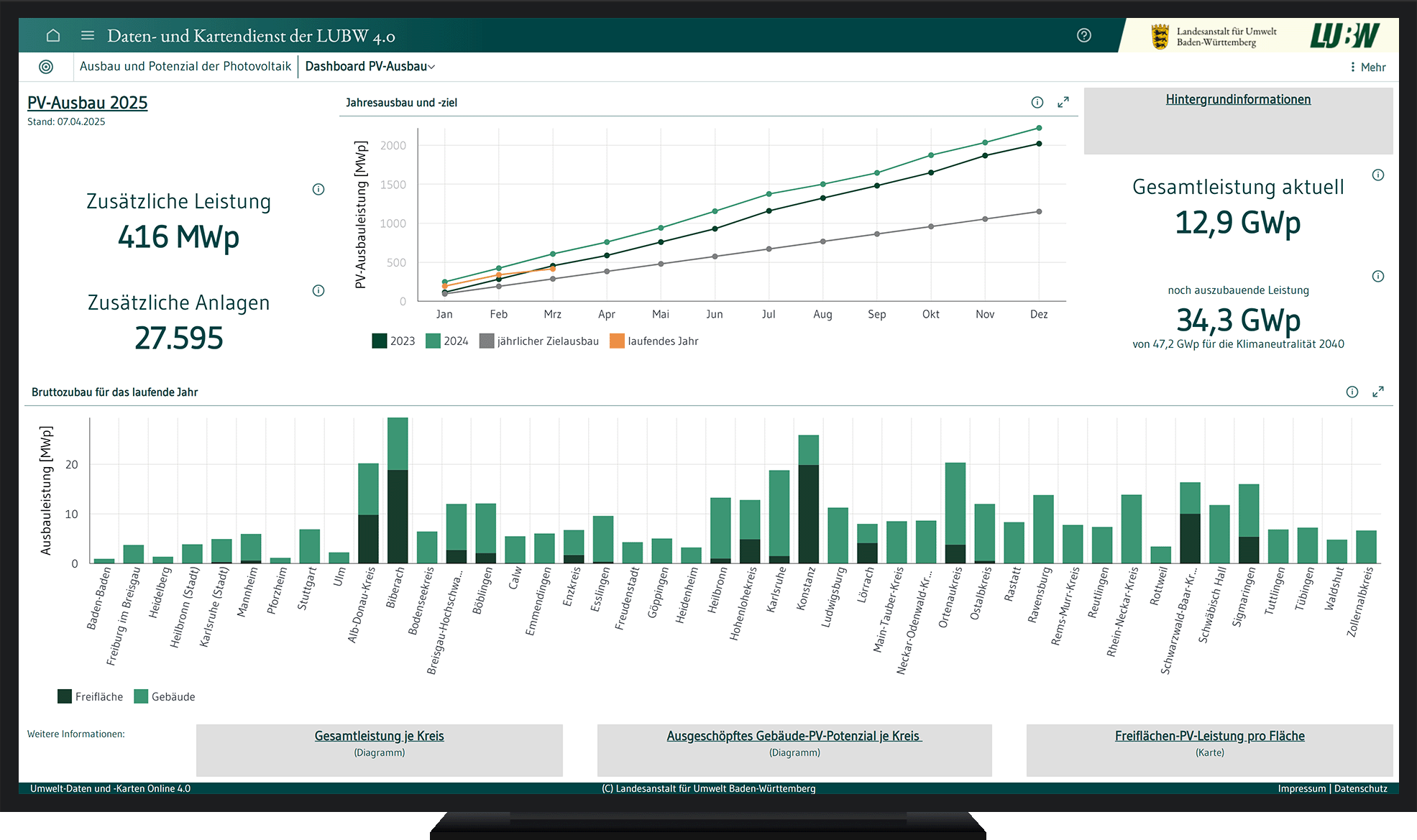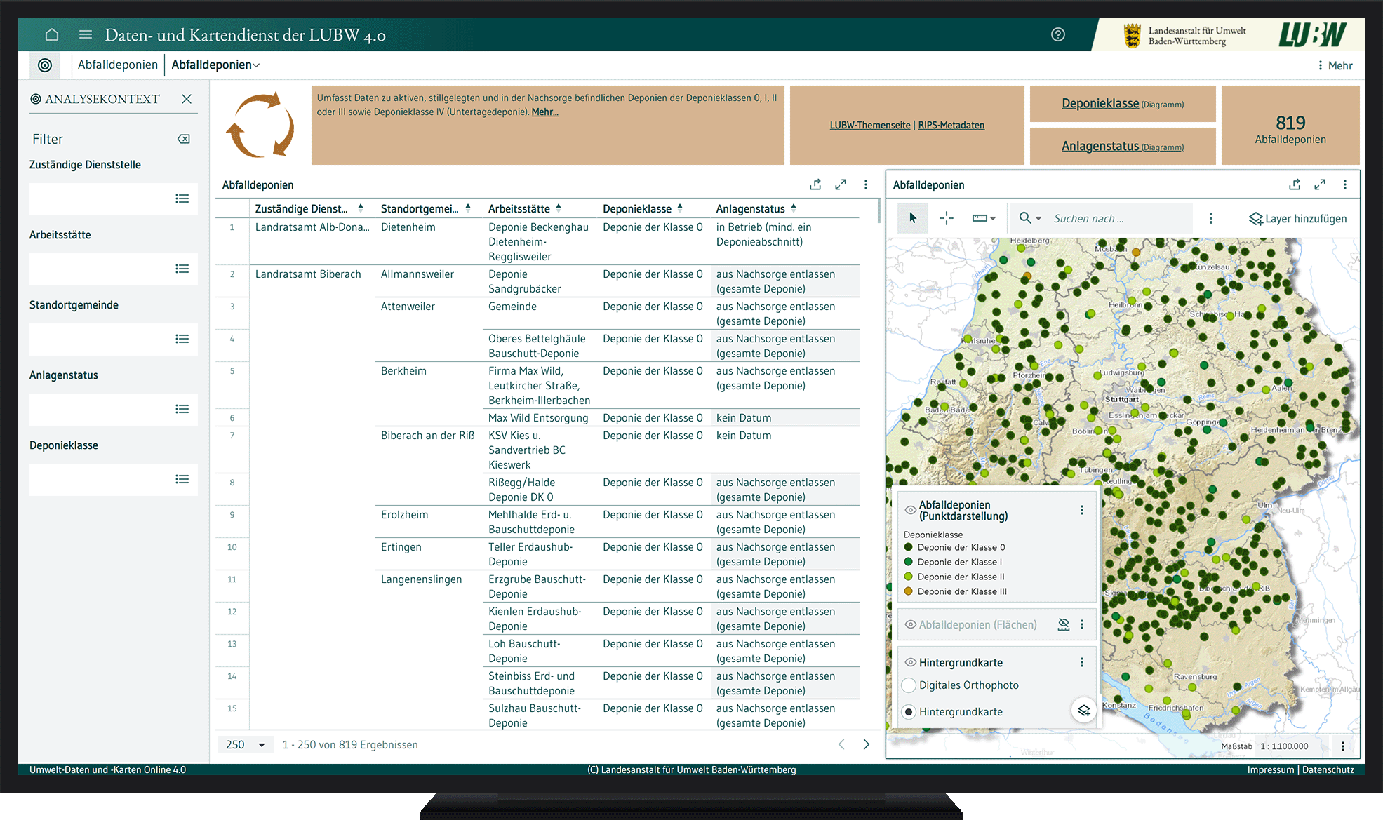 Der öffentlich zugängliche Daten- und Kartendienst 4.0 der Landesanstalt für Umwelt Baden-Württemberg (LUBW) bietet interaktiven Zugriff auf frei verfügbare Umweltdaten und digitale Datenbestände. Die Informationen stammen aus Mess- und Untersuchungsprogrammen der LUBW sowie aus dem Informationsverbund der kommunalen und staatlichen Umweltdienststellen des Landes. Mit über einer Million jährlicher Aufrufe ist der Dienst heute eine zentrale Informationsquelle für Umweltwissen in Baden-Württemberg. Die Version 4.0 wird langfristig den bisherige Daten- und Kartendienst der LUBW ablösen, der seit 2005 online angeboten wird. Die Themenbereiche werden dabei in Einzelprojekten mit den Möglichkeiten der neuen Produktgeneration migriert. Mit dem Online-Portal erfüllt die LUBW auf umfassende Weise die gesetzlichen Verpflichtungen des Umweltverwaltungsgesetzes.