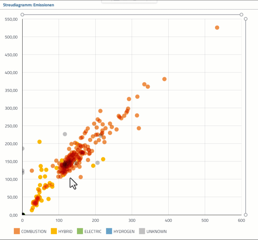 Ab der Autumn-Version stehen außerdem Streudiagramme in disy Cadenza zur Verfügung. Streudiagramme sind ein klassisches Werkzeug der Datenanalyse und zeigen Zusammenhänge zwischen zwei numerischen Variablen auf einen Blick. Sie machen Korrelationen, Ausreißer und Trends sichtbar und erleichtern so die Interpretation komplexer Daten. Zusätzlich können Punkte nach einer weiteren Dimension eingefärbt werden, was die Analyseoptionen erweitert und eine mehrdimensionale Datenanalyse unterstützt. Mit der Einführung von Streudiagrammen in disy Cadenza wird ein oft geäußerter Wunsch unserer Nutzer:innen erfüllt – besonders in der Forschung ist dieses Feature nahezu unverzichtbar.