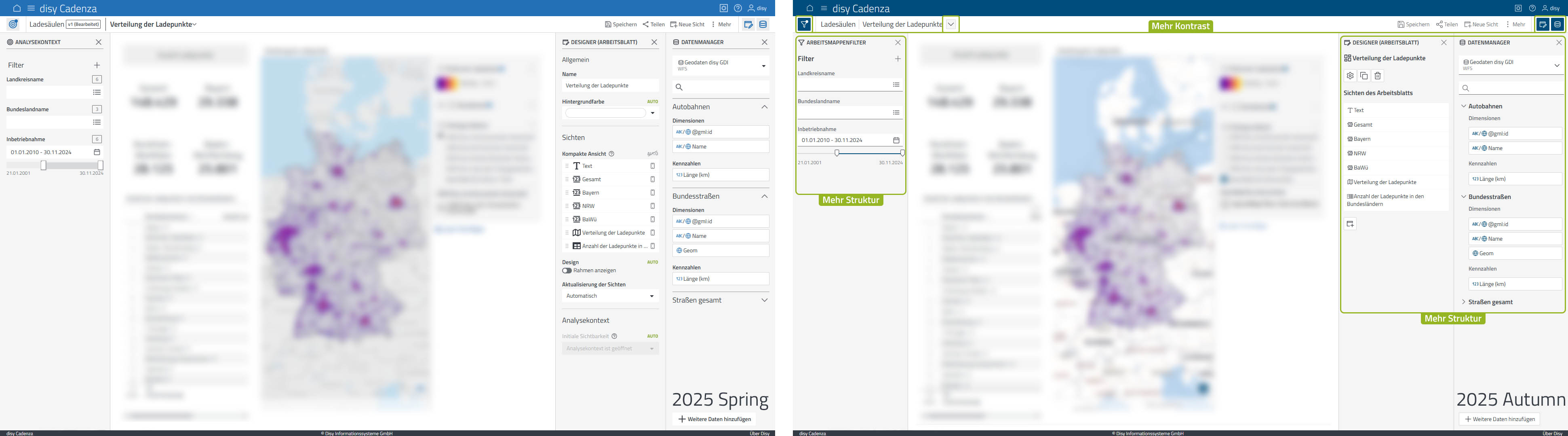 Die kalten Herbsttage machen uns gar nichts aus, denn disy Cadenza 2025 Autumn steht mit vielen neuen Highlights in den Startlöchern. Für die Autumn-Version hat sich disy Cadenza ordentlich rausgeputzt: Es glänzt in einem neuen, modernen Design und ausgeklügelten Funktionalitäten für noch mehr Barrierefreiheit. Im Fokus stehen außerdem die neuen Diagrammfunktionen, wie beispielsweise die Kombinations- und Streudiagramme. Außerdem wurden die Kartenfunktionalitäten optimiert. Dank clientbasiertem Rendering ist das Arbeiten mit Karten nun noch flüssiger und schneller. Hinzu kommen benutzerdefinierte Analyseerweiterungen direkt in der Karte und die Möglichkeit, Webseiten nahtlos ins Dashboard einzubinden – alles für effizientere, inklusivere und smartere Analysen. Hört sich spannend an? Ist es auch! Lesen Sie weiter und gewinnen Sie erste Eindrücke von disy Cadenza 2025 Autumn.