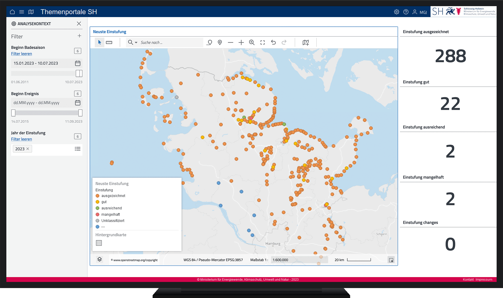Das Themenportal Badegewässer des Ministeriums für Justiz und Gesundheit (MJG) Schleswig-Holstein ist ein modernes Instrument für das Monitoring der Wasserqualität und dient der Steuerung von Arbeitsprozessen. Alle Untersuchungsdaten werden zentral gespeichert und mit disy Cadenza ausgewertet. So lassen sich Grenzwertüberschreitungen, bakterielle Belastungen oder potenzielle Verschmutzungsquellen frühzeitig erkennen. Aktuell steht die Anwendung den Mitarbeitenden des MJG und des Landesamts für soziale Dienste zur Verfügung. Die Daten werden laufend aktualisiert, interaktiv auf Karten visualisiert und mit Hintergrundinformationen ergänzt. Dank der Embedding-Funktionalität von Cadenza ist die Lösung direkt in den Webauftritt der Landesregierung eingebunden. Perspektivisch lässt sich das Portal modular erweitern und für weitere Zielgruppen wie Gesundheitsämter oder die Öffentlichkeit öffnen.