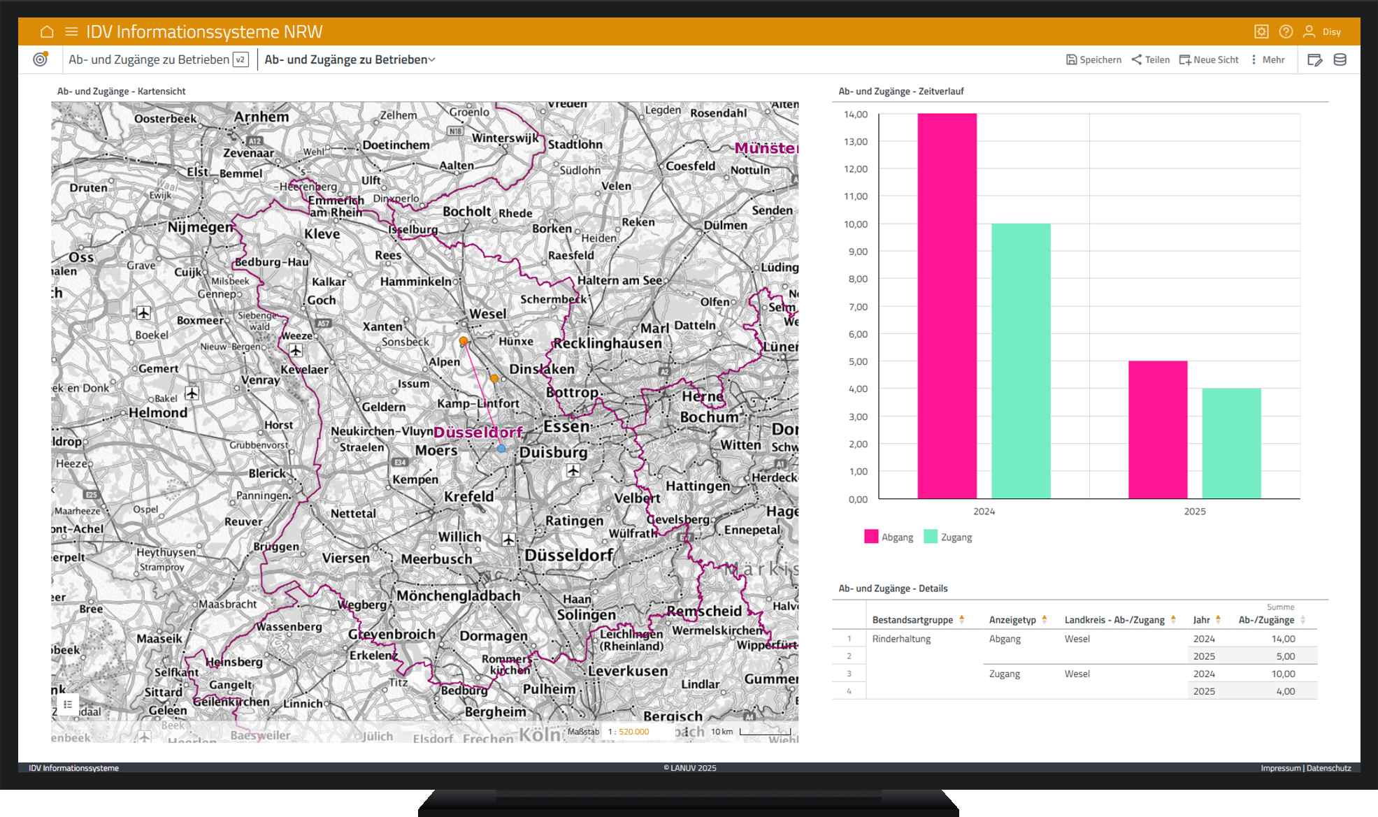 Die Überwachung der Tiergesundheit in Nordrhein-Westfalen war lange Zeit mühsam und zeitaufwendig. Wichtige Informationen lagen in unterschiedlichen Systemen vor und mussten manuell zusammengeführt werden. Eine schnelle und gezielte Reaktion auf Auffälligkeiten war dadurch erschwert.