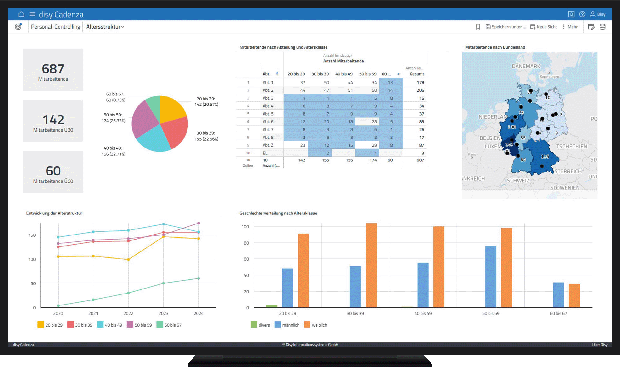 Verschaffen Sie sich einen Überblick über Altersverteilung, Geschlechterstruktur und regionale Verteilung Ihrer Mitarbeitenden – datenbasiert und vorausschauend.