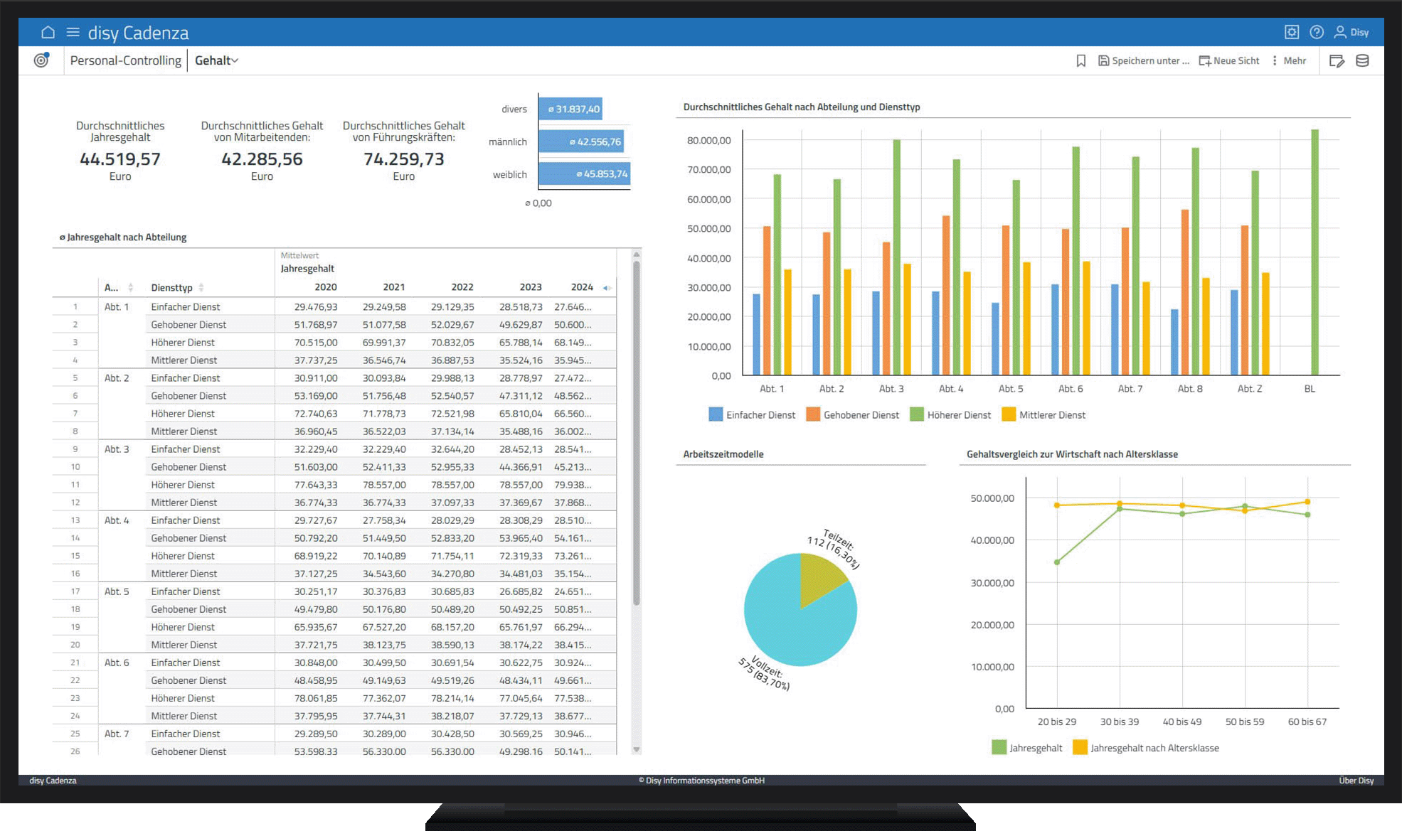 Erkennen Sie Gehaltsstrukturen nach Diensttyp, Abteilung, Alter oder Geschlecht – kompakt und aussagekräftig aufbereitet.
