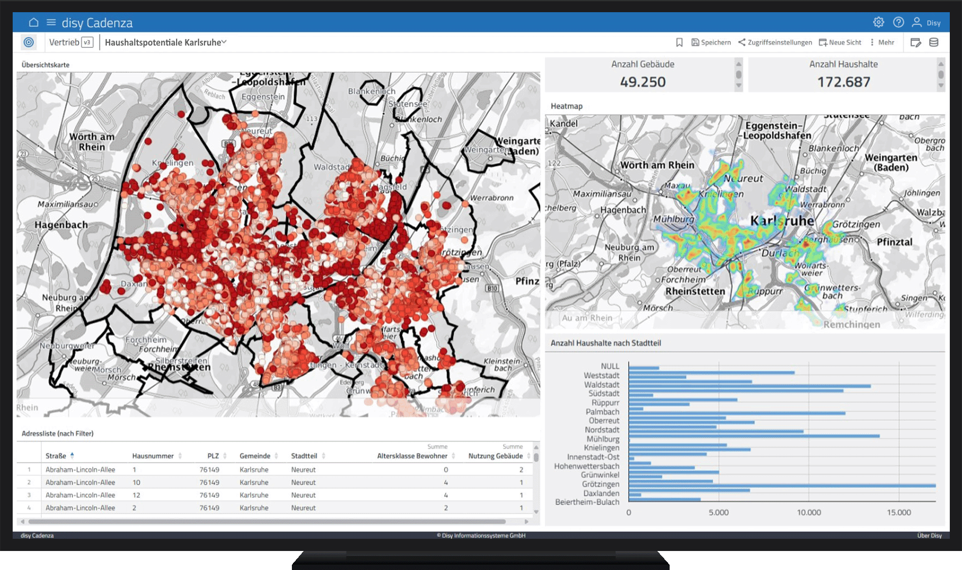 - Intelligentes Web-GIS mit BI-Funktionen: Visualisieren und analysieren Sie Daten räumlich und zeitlich, erstellen Sie aussagekräftige Dashboards und erhalten Sie fundierte Entscheidungsgrundlagen für operative und strategische Maßnahmen