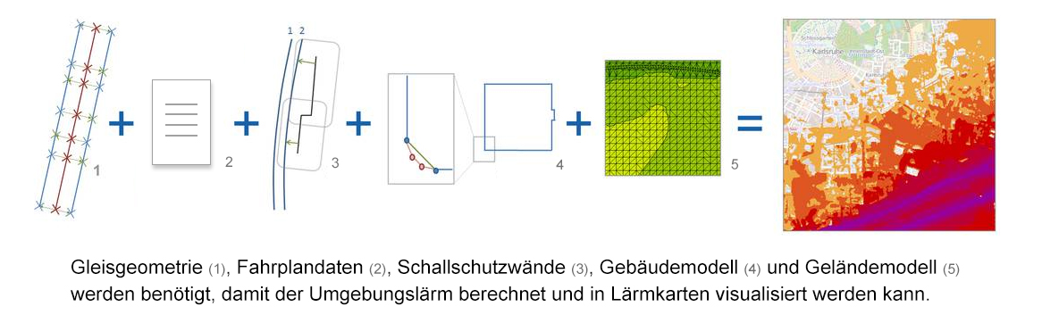 In die Berechnung der Lärmbelastung gingen über 33.000 Schienenkilometer, rund 25.000 Brücken, 700 Tunnel, 14.000 Bahnübergänge, tausende Kilometer Schallschutzwände, 60 Millionen Gebäude, zehntausende Quadratkilometer Geländemodell und weitere Datenquellen ein. Dieses heterogene Datenvolumen kann nur noch mit automatisierten Prozessen geprüft, homogenisiert und aufbereitet werden.