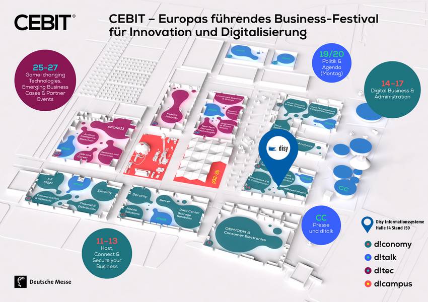 Experts from Disy Informationssysteme GmbH will be available for talks and discussions at CEBIT, stand J59 in hall 14, which is in the eGovernment area. Appointments can already be arranged: by telephone on +49 (0)721 16006-000 or by email to kontakt@disy.net. Disy eCodes for your visit will be sent upon request, which you can then use to register online for your personalised season ticket.