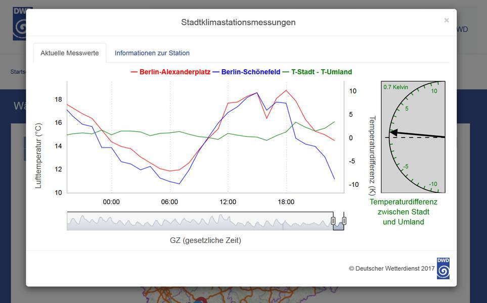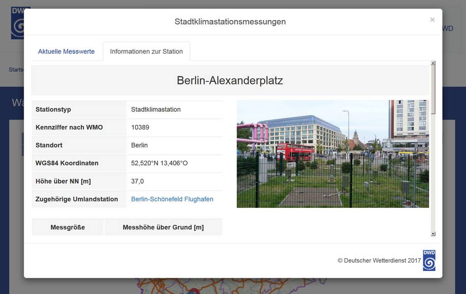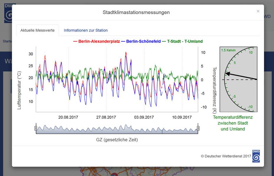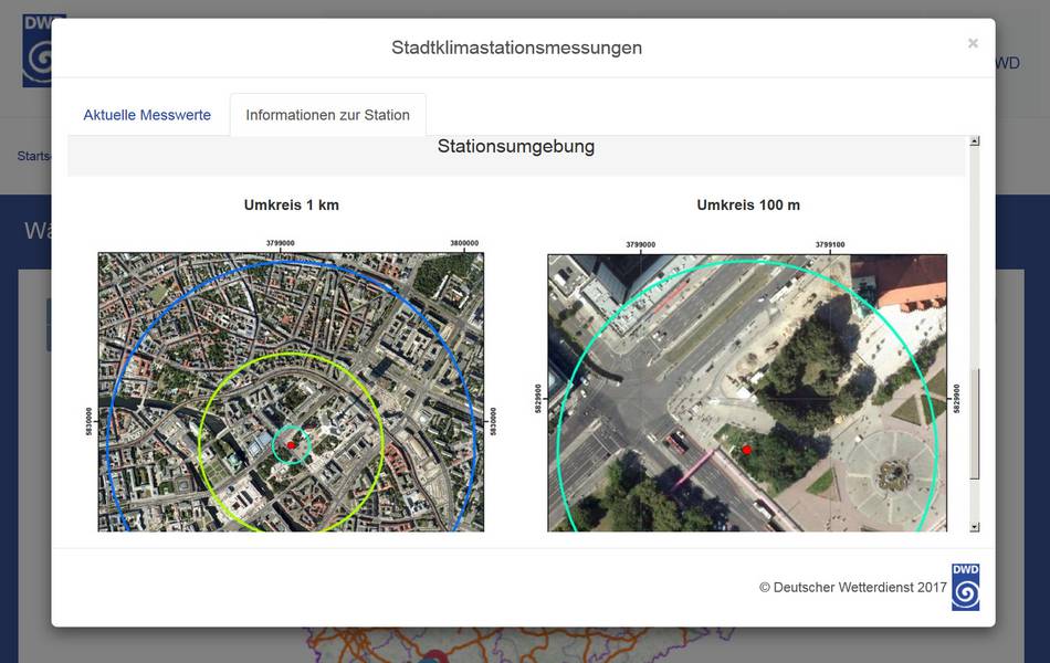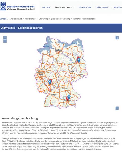 So hat Disy seit der Beauftragung zum Beispiel ein Stadtklima-Modul für den DWD realisiert. Da das Stadtklima ganz allgemein als gegenüber dem Umland verändertes Klima gilt und zunehmend von Interesse zum Beispiel für Stadtplaner ist, baut der DWD bis zu zehn Stadtklimastationen auf und möchte die Messergebnisse dieser Stationen via OGC-konformer Web-Dienste im Internet präsentieren. Per Mausklick auf einen Stationspunkt innerhalb einer Karte soll eine Messergebnisgrafik angezeigt werden. Disy hat dafür eine Single Page Application konzipiert, bei der die Kartenkomponente mithilfe von Javascript und der OpenLayers-Bibliothek definiert und mit den Stationsdaten verknüpft wird. Wichtig war dem DWD, dass der Aufwand möglichst gering ist und eine “leichte“ Lösung geschaffen wird. Und genau die hat Disy mit dem Stadtklima-Modul geschaffen.