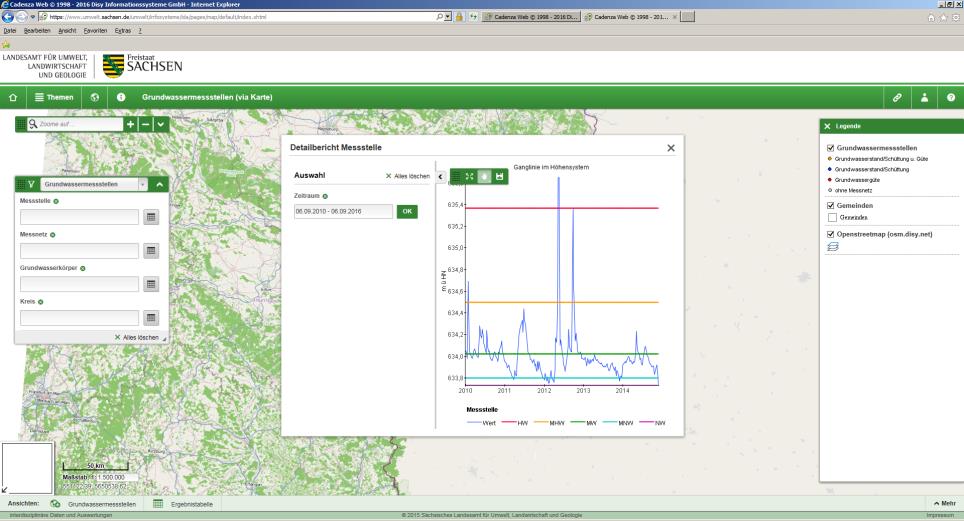 Um die in vielen heterogenen Systemen und Datenbanken verteilt vorliegenden Daten ämter- und themenübergreifend auswerten zu können, wurde zunächst der Einsatz von Cadenza als organisationsweites Recherche- und Berichtssystem getestet. Die Federführung hatte dabei das Sächsische Landesamt für Umwelt, Landwirtschaft und Geologie (LfULG), die Prüfung nahm Disy anhand verschiedener Daten, unter anderem der bereits mit Cadenza verwalteten Artdaten, der Wasserdaten und der Geobasisdaten, vor. Im Einzelnen wurde der Einsatz von Cadenza Desktop als Desktop-Arbeitsplatz für Fachanwender geprüft, der Einsatz von Cadenza Web für Entscheidungsträger und Endanwender, die über ihren Browser auf vorbereitete Auswertungen und Berichte zugreifen, der Einsatz von Cadenza Mobile für die mobile Datenrecherche und -erfassung sowie der Einsatz von Web-Service-Schnittstellen für Drittanwendungen und Portale.