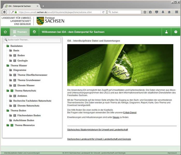 Die neue Datenauswerteplattform iDA steht ab sofort den Mitarbeitern im Geschäftsbereich des SMUL für Recherchen zur Verfügung und ermöglicht derzeit den Zugriff auf Fachdaten und Karten aus Umwelt, Landwirtschaft und Geologie. Durch die Integration weiterer Themen wird iDA schrittweise zu einer zentralen Plattform ausgebaut. Der Öffentlichkeit steht das Datenportal iDA unter dem Link www.umwelt.sachsen.de/umwelt/infosysteme/ida zur Verfügung.