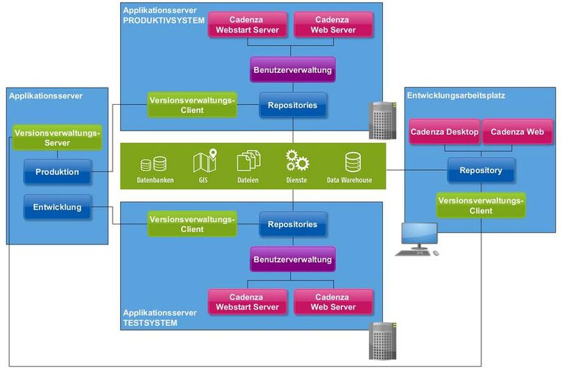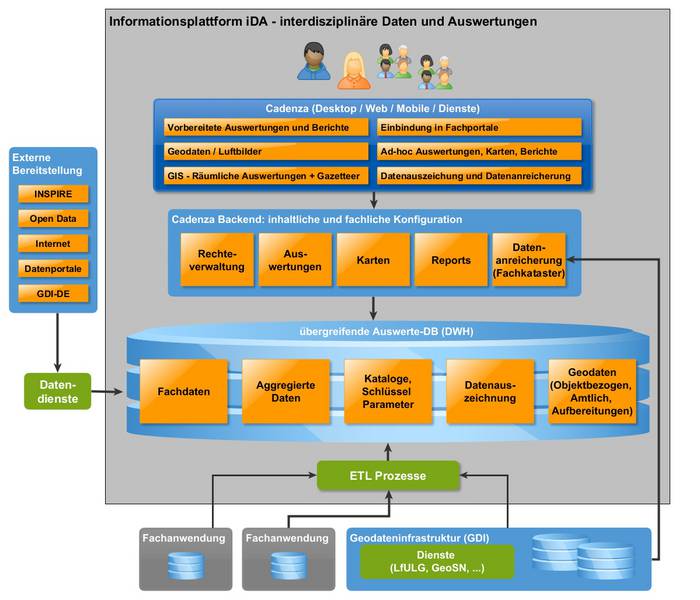 In das Gesamtlösungskonzept iDA, das für interdisziplinäre Daten und Auswertungen steht, sind sowohl Cadenza als auch das Data Warehouse eingebettet. Zudem ist es gelungen, die umfangreiche Geodateninfrastruktur, basierend auf der ESRI-Technologie, über die Schnittstellen zu integrieren. Über Cadenza Desktop und Cadenza Web können Anwender auf die hier aufbereiteten Fachthemen zugreifen. Über die Benutzerverwaltung wird dabei gesteuert, welche Themen für welchen Benutzer zur Verfügung stehen. Dabei kann der Anwender gezielt in Einzelthemen recherchieren oder einzelne Themen miteinander kombinieren. Informationsseiten geben dem Benutzer Hintergrundinformationen zu den angebotenen Themen. Die Ergebnisse können in Form von Tabellen, Diagrammen, Karten und Berichten visualisiert und filebasiert ausgegeben (CSV, Excel, Shape, PDF, Word, Bildformate) werden.
