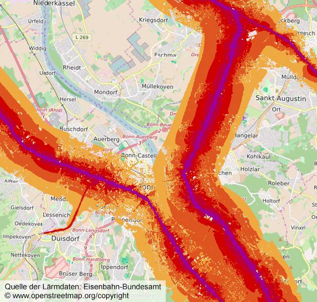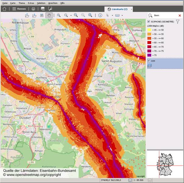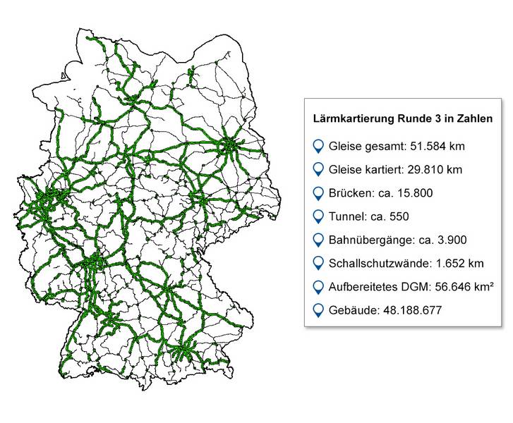 Wirtschaftliches Wachstum und steigender Wohlstand sind eng verknüpft mit wachsendem Personen- und Güterverkehr und damit steigender Lärmbelastung. Darum gibt die Europäische Union in der EU-Umgebungslärmrichtlinie verschiedene Instrumente zur Reduzierung vor. So ist das Eisenbahn-Bundesamt (EBA) verpflichtet, alle 5 Jahre Lärmkarten für die Schienenwege von Eisenbahnen des Bundes auszuarbeiten. Jetzt hat das Eisenbahn-Bundesamt die dritte Kartierungsrunde abgeschlossen und alle Ballungsräume mit mehr als 100.000 Einwohnern bzw. Haupteisenbahnstrecken mit einem Verkehrsaufkommen von über 30.000 Zügen pro Jahr erfasst. Die Berechnung umfasst etwa 16.500 Streckenkilometer Haupteisenbahnstrecken und 70 Ballungsräume. Damit deckt die aktuelle Lärmkartierung eine Fläche von mehr als 50.000 Quadratkilometern ab.